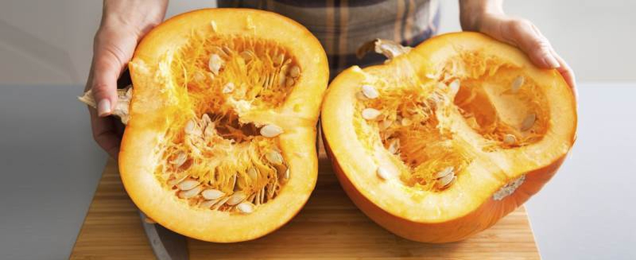 კოვზით გოგრის ორივე ნაწილიდან თესლი და რბილობი ამოიღეთ.