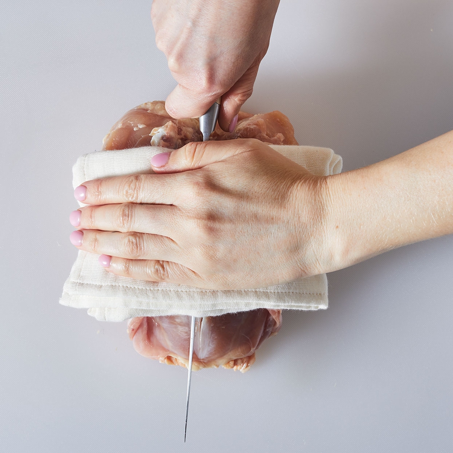ახლა მკერდი ორ ნაწილად გაჭერით. მკერდი კანის მხრით დაბლა განათავსეთ. ხელის დაზიანებისგან დასაცავად მოკეცეთ სამზარეულოს პირსახოცი და განათავსეთ იგი მძიმე, ბასრი დანის თავზე. მკერდის ძვლისა და მკერდის ცენტრისაკენ არსებული ხრტილების გასაჭრელად თქვენი წონა გამოიყენეთ.