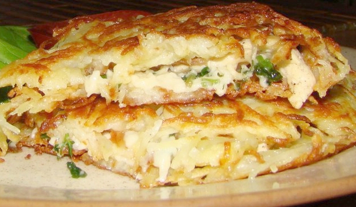 გახურებულ ტაფას დაასხით იმდენი მცენარეული ზეთი, რომ ძირი დაუფაროს, გაანაწილეთ ზედ გახეხილი კარტოფილი და კარგად დატკეპნეთ. კარტოფილის ბლინი უნდა მიიღოთ.