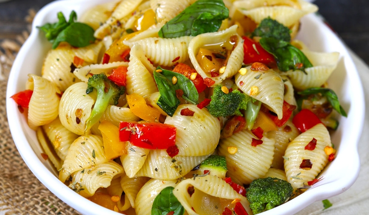 გამოსაცხობ ჭურჭელში მოათავსეთ პასტა. მოაყარეთ ბოსტნეული და მოასხით სოუსი.