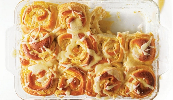 გააცხელეთ ღუმელი 375°-ზე. მოაცილეთ ცელოფანი ფუნთუშებს და აცხვეთ 25 წუთით, სანამ მოოქროსფერ-მოყავისფრო არ გახდება. მოასხით გასაფორმებლად მომზადებული მასა და მიირთვით გემრიელად!