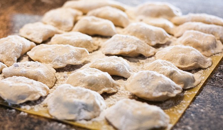 წინასწარ გამზადებული ცომი 4 ნაწილად დაყავით და თითოეული ფქვილმოყრილ ზედაპირზე 3 მმ სისქეზე გააბრტყელეთ. ჭიქით წრეები გამოჭერით და კოვზით კარტოფილისა და ყველის შიგთავსი გადაიტანეთ. ვარენიკები კარგად შეკარით.